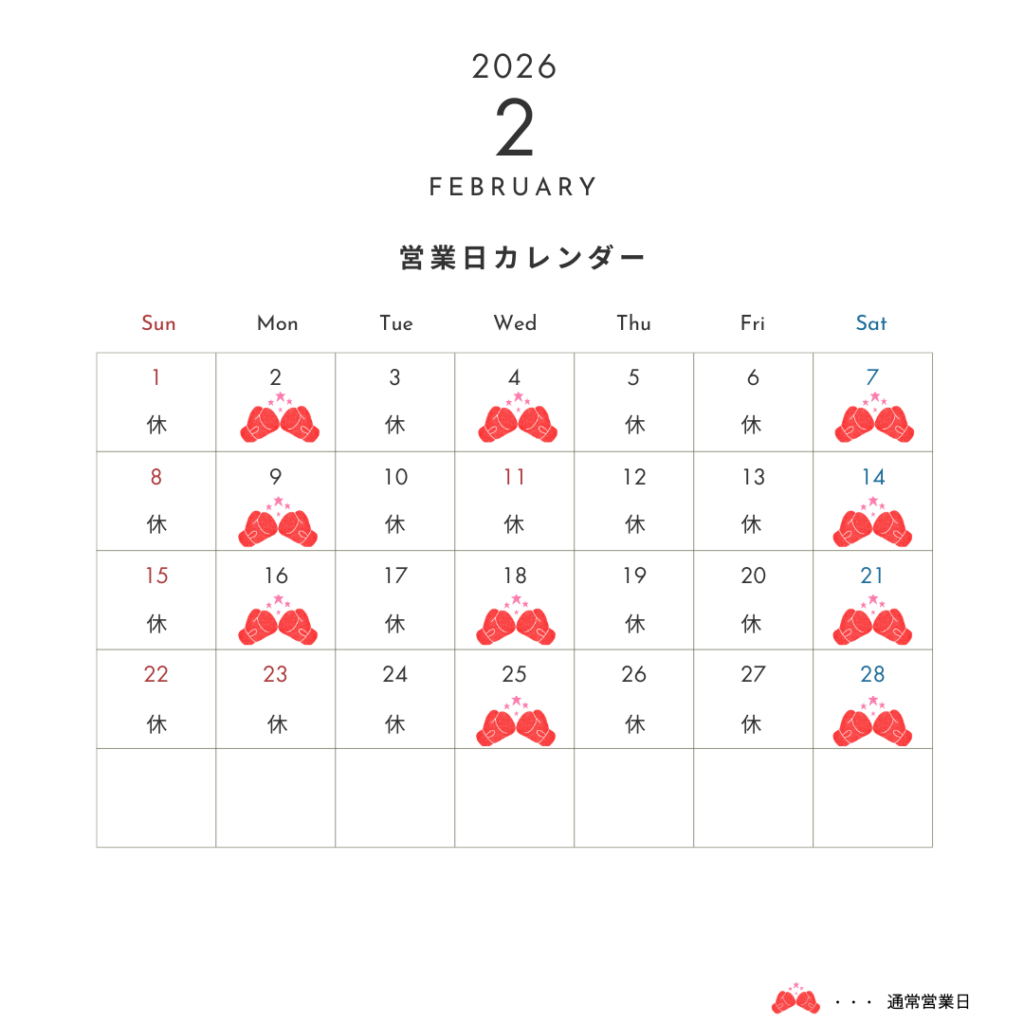 2026年2月営業カレンダー更新 2026 2/01 お知らせ 【休館日のお知らせ】 誠に勝手ながら、2月11日(水)、23日(月)の祝日は、休館日とさせていただいております。該当日は各クラスの実施はございませんので、お間違いのないようご注意ください。ご不便をおかけいたしますが、何卒ご理解のほどよろしくお願いいたします。 お知らせ 2026年1月営業カレンダー更新